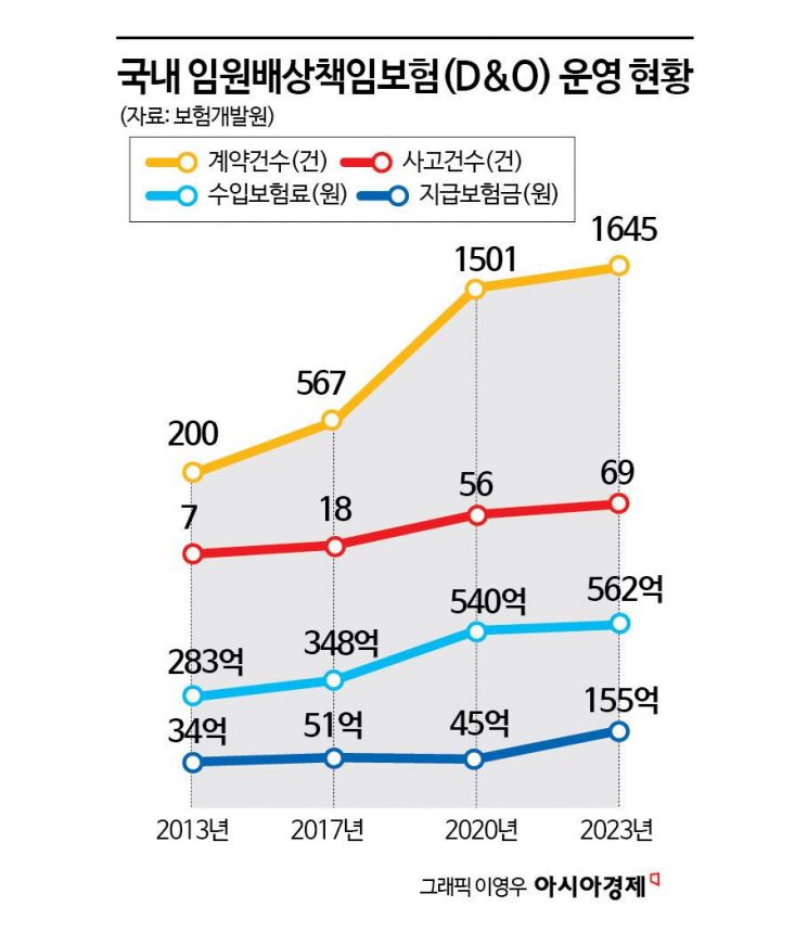 보험개발원과 보험업계 등을 통해 확보한 국내 보험사의 D&O 계약건수는 2013년 200건에서 2023년 1645건으로 약 8.2배 증가했다. 같은 기간 수입보험료는 283억원에서 562억원으로 2배, 지급보험금은 34억원에서 155억원으로 4.6배 늘었다. 2023년 기준으로 삼성·DB·현대·메리츠·KB·한화·NH농협·롯데·흥국·하나·신한EZ·MG·ACE·미쓰이 등 14개사가 D&O를 판매했다.